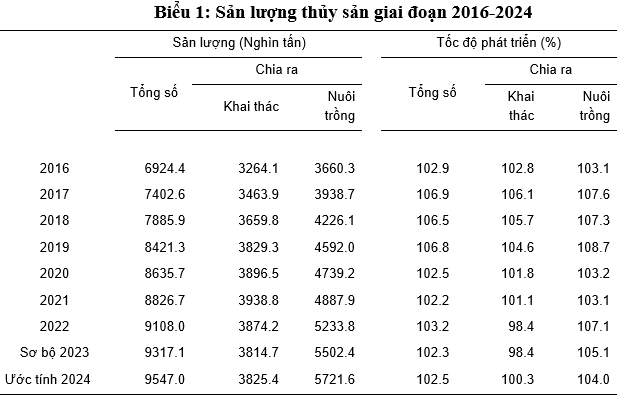 Sự phát triển của ngành thủy sản đã kéo theo sự gia tăng mạnh mẽ sản lượng thủy sản. Bình quân mỗi năm giai đoạn 2016-2024, nước ta có 7391 nghìn tấn thủy sản, trong đó khai thác 3304 nghìn tấn và nuôi trồng 4087 nghìn tấn; tốc độ tăng bình quân là 4,0%, trong đó khai thác tăng 3,1%/năm và nuôi trồng tăng 5,4%/năm. Sản lượng thủy sản tăng không những đáp ứng đầy đủ nhu cầu trong nước mà mỗi năm còn xuất khẩu thủy sản thu về bình quân 7,8 triệu USD/năm.