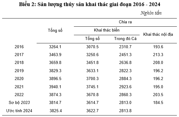 Sản lượng khai thác thủy sản của Việt Nam có sự gia tăng đáng kể tăng dần qua các năm, từ 3.264,1 nghìn tấn năm 2016 lên 3.825,4 nghìn tấn năm 2024, tăng 17,2%, bình quân mỗi năm khai thác được 3730 nghìn tấn. Trong đó, chủ yếu là thủy sản khai thác biển chiếm bình quân 94% tổng sản lượng thủy sản khai thác, trong đó sản lượng của nhóm là các loại thủy sản nổi nhỏ (cá nục sồ, cá sòng Nhật, cá ngân, cá bạc má, cá ba thú) và động vật chân đầu (mực nang, mực ống) có chiều hướng tăng lên, trong khi đó sản lượng nhóm cá đáy giảm đi. Mặc dù, vừa đảm bảo khai thác bền vững và bảo vệ nguồn lợi thủy sản, những năm gần đây ngành khai thác thủy sản biển đã tuân thủ các quy định về chống khai thác thủy sản bất hợp pháp IUU nhưng sản lượng thủy sản khai thác biển cũng tăng lên đáng kể từ 3.070.5 nghìn tấn năm 2016 lên 3.622,7 năm 2024. Có thể thấy rằng, mặc dù tình hình dịch Covid-19 diễn ra phức tạp trong năm 2020-2022, nhưng sản lượng thủy sản khai thác của nước ta vẫn tăng hoặc chỉ giảm nhẹ, đảm bảo nhu cầu trong nước và xuất khẩu. Sản lượng nhóm cá khai thác biển chiếm 77,7% trong tổng sản lượng khai thác thủy sản biển, trong đó chủ yếu là cá nổi nhỏ và các loại cá ngừ và họ cá ngừ. Tuy nhiên, nguồn lợi thủy sản là tài nguyên thiên nhiên có khả năng tái tạo, nhưng hữu hạn. Mỗi vùng biển có một trữ lượng hải sản nhất định và chỉ cho phép khai thác một sản lượng nhất định. Nếu khai thác vượt qua khả năng khai thác cho phép thì sẽ gây ra suy giảm nguồn lợi. Khả năng cho phép khai thác thường khoảng 43 – 50% tổng trữ lượng thủy sản (tùy vùng biển và loài thủy sản).