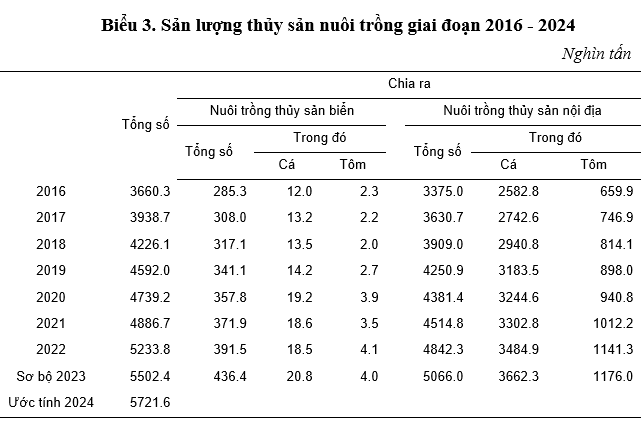 Sản lượng nuôi trồng thủy sản đã tăng trưởng đáng kể nhờ áp dụng các mô hình nuôi trồng thủy sản cho năng suất và chất lượng cao, tổng sản lượng thủy sản giai đoạn 2016-2024 đạt 36,8 triệu tấn, trong đó năm 2024 đạt mức cao nhất với 5,7 triệu tấn, tăng 56,3% so với năm 2016, bình quân mỗi năm tăng 5,1%. Năm 2024, sản lượng thủy sản nuôi trồng ước đạt 5.721,6 nghìn tấn, tăng 4,0% so với năm trước, trong đó: Cá đạt 3.826,6 nghìn tấn, tăng 3,9%; tôm đạt 1.246,5 nghìn tấn, tăng 5,6%; thủy sản khác đạt 648,5 nghìn tấn, tăng 1,4%.